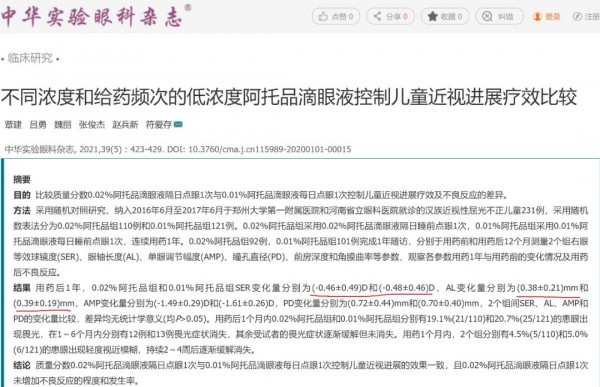 很多文献表明,只戴普通眼镜每年约增长100°近视,使用低浓度阿托品(0.01%和0.02%)进行防控近视,可以把近视增长幅度压制在50°/年,眼轴增长压制在0.38mm/年。